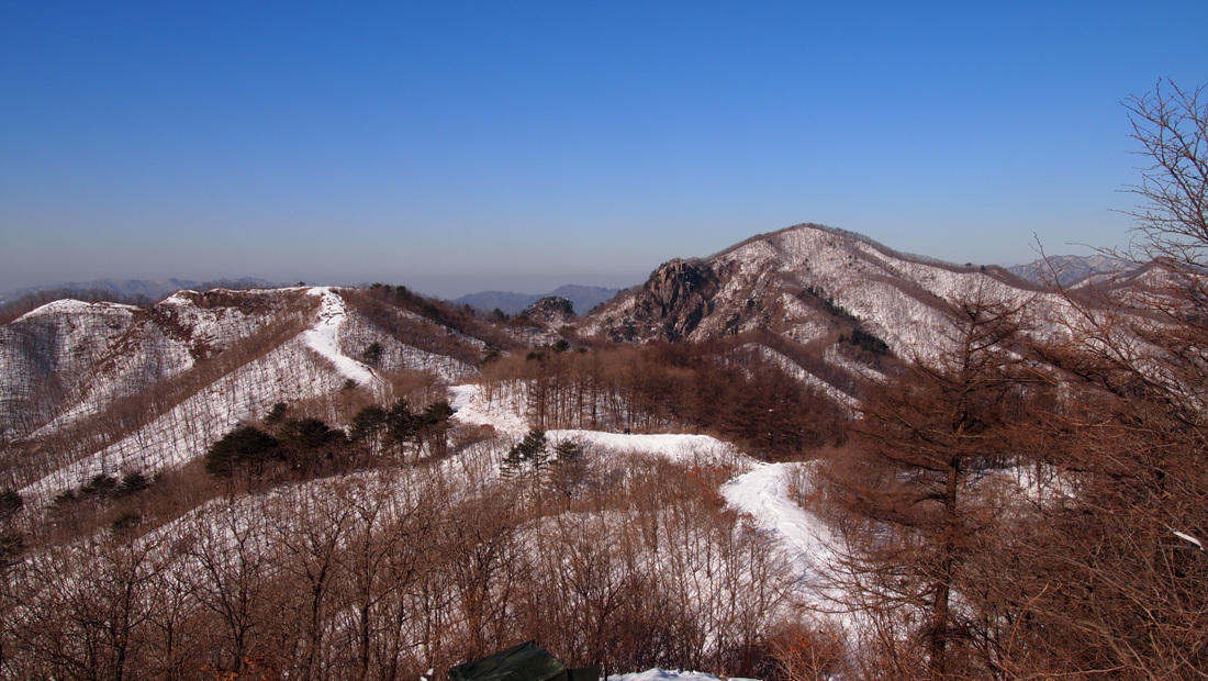 ¡ã ÇѺÏÁ¤¸ÆÀ» µû¶ó ±¹¸ÁºÀ(1,168.1m), ¿ÞÂÊÀº ȾÇÁö¸ÆÀÇ ¼®·æ»ê(1,147m), °¡¿îµ¥ ¸Ö¸® ¸íÁö»ê(1,267m)°ú ¿¬Àλê(1,068.2m).